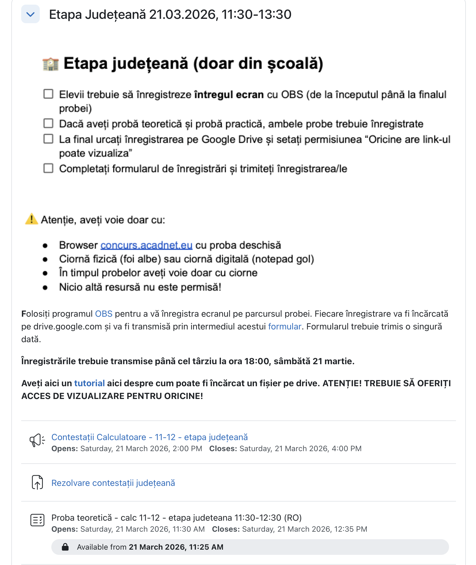 Scrieți aici dacă aveți probleme cu platforma de concurs.acadnet.eu și nu puteți vizualiza corect "Etapa Județeană" din cadrul secțiunii la care v-ați calificat. Cum ar trebui să se vadă (aveți o imagine mai jos). Evident, conținutul diferă în funcție de secțiunea voastră.